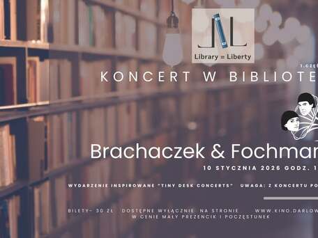 10 stycznia 2026 (w sobotę) o godz. 19:00, między półkami biblioteki zagra duet Brachaczek & Fochmann - muzycy zespołu BIFF, znani z połączenia absurdu, inteligencji i przebojowości. Usłyszycie ich piosenki w wersji kameralnej: pełnej energii, artystycznej chemii, śmiechu, wzruszeń.
