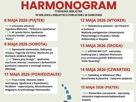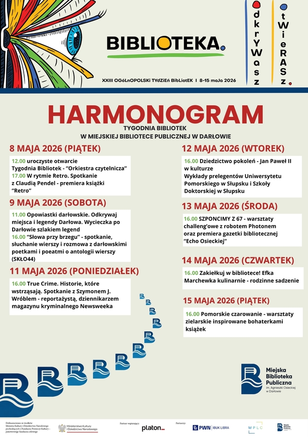 Zapraszamy na 23. Ogólnopolski Tydzień Bibliotek w dniach 8–15 maja 2026 roku, organizowany pod hasłem „Biblioteka. Otwierasz. Odkrywasz”. Szczegóły dotyczące lokalnych atrakcji dostępne na plakatach poniżej i na naszym profilu na FB