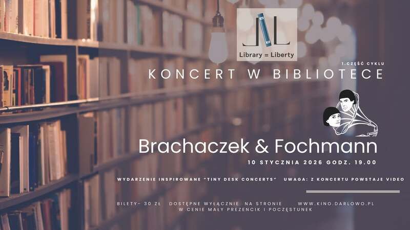 10 stycznia 2026 (w sobotę) o godz. 19:00, między półkami biblioteki zagra duet Brachaczek & Fochmann - muzycy zespołu BIFF, znani z połączenia absurdu, inteligencji i przebojowości. Usłyszycie ich piosenki w wersji kameralnej: pełnej energii, artystycznej chemii, śmiechu, wzruszeń.